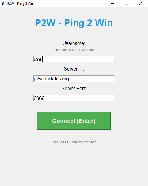 3. Connect to a server (like the test server at p2w.duckdns.org on port 6969)